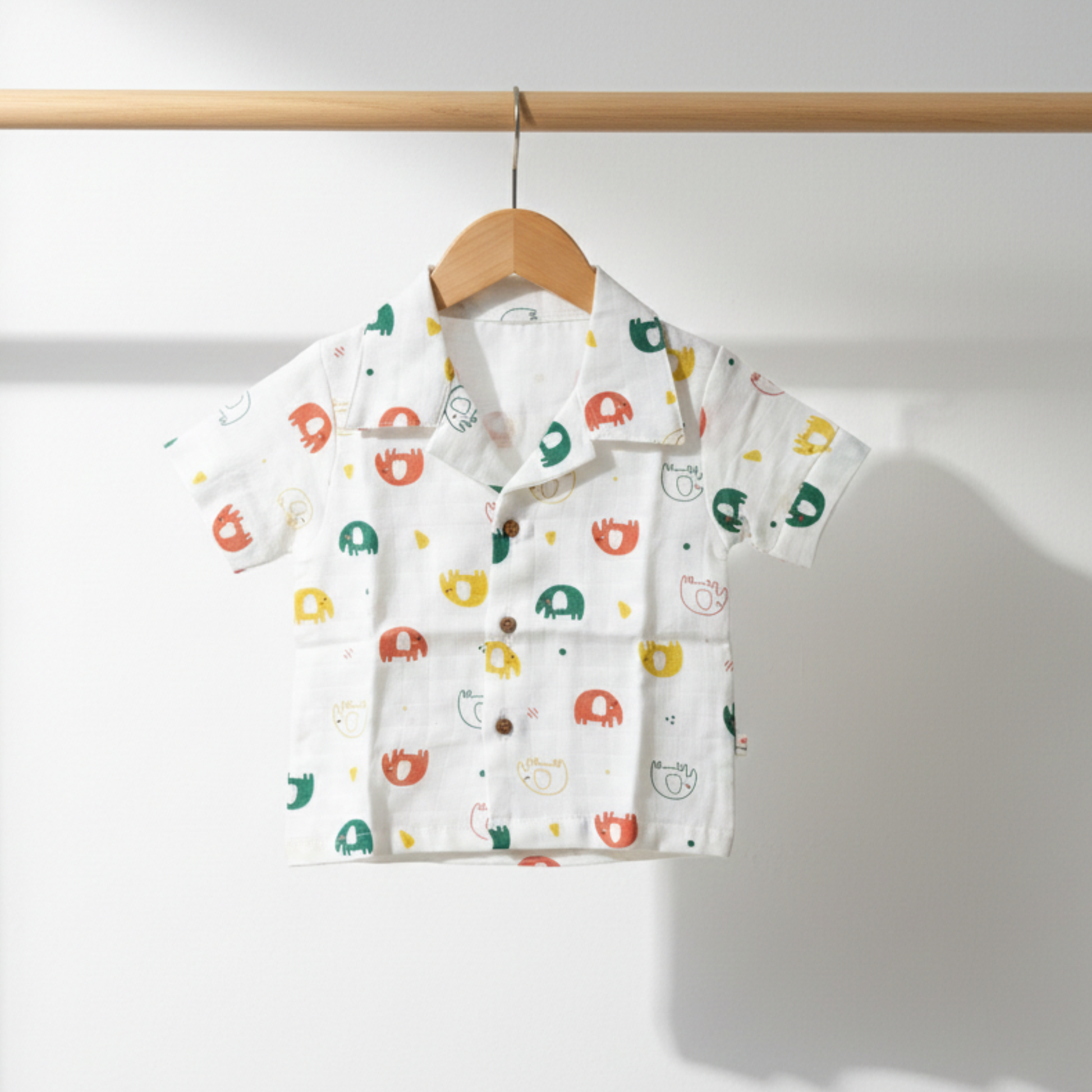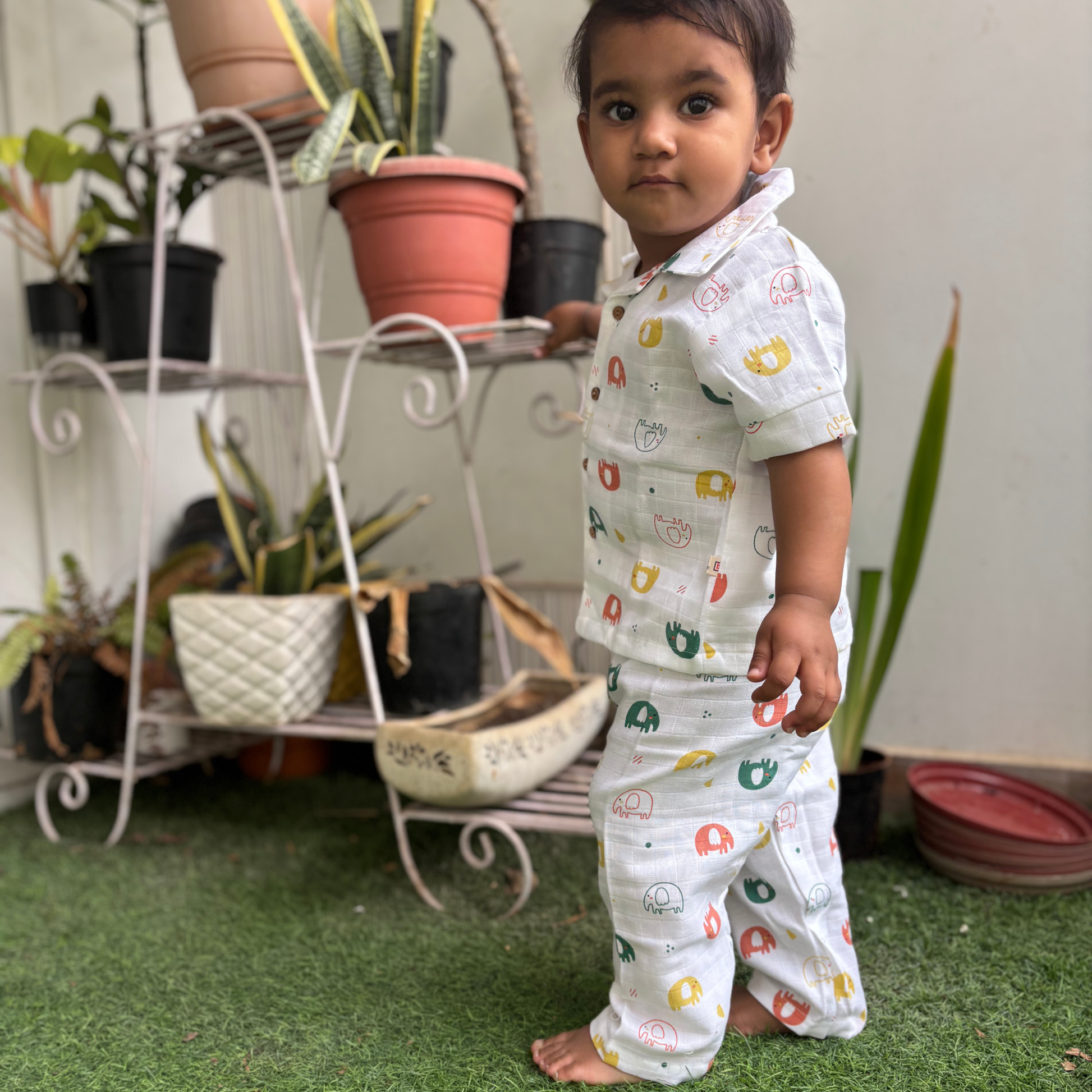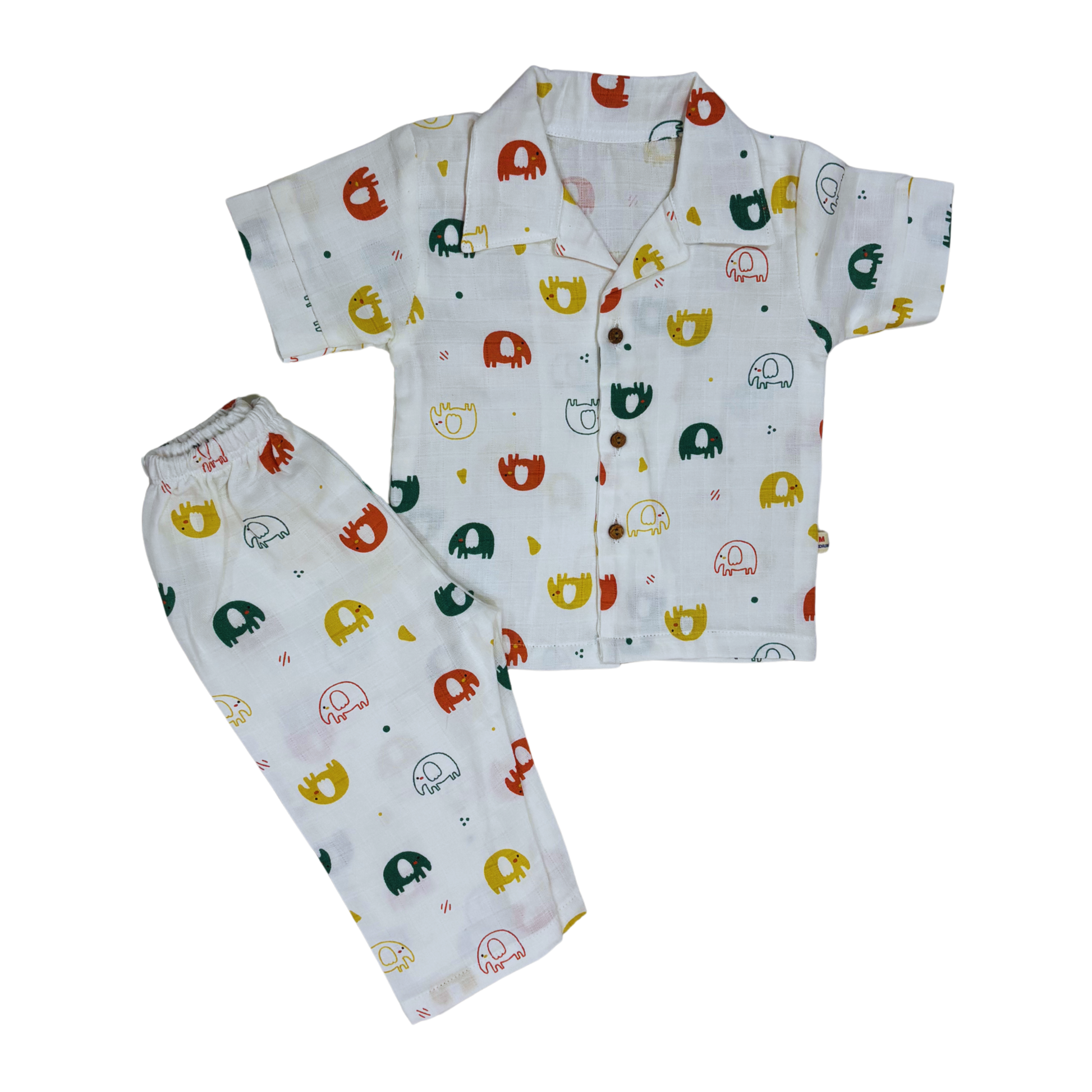 Style and Cut: The set features a classic collared shirt with short sleeves and full-length matching pyjama bottoms. The shirt has a button-down front, giving it the look of a miniature, soft resort shirt or Cuban collar top, which is comfortable and easy to put on. The pants have a relaxed fit, ensuring unrestricted movement for playtime or sleep.